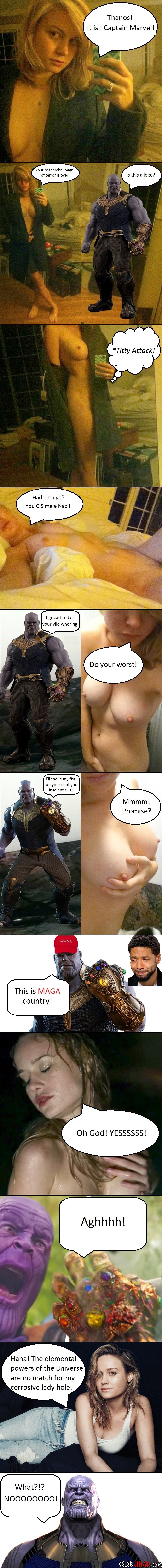 Luckily they won’t have to, for Celeb Jihad operatives have obtained a leaked storyboard of the Brie Larson “Captain Marvel” final nude battle against Thanos below.