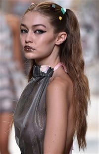 Gigi Hadid brazenly walks the runway in Milan looking like she just blew a clown with her bare boobs on full display in a completely see through top in the disturbing photos below.