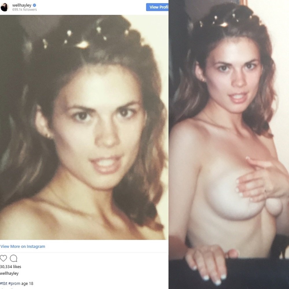 A few months ago Marvel’s “Agent Carter” star Hayley Atwell posted a seemingly innocent photo on her Instagram of her at 18-years-old getting ready for her high school prom for “TBT” (Throwback Thursday). However, when the full photo was recently leaked we were able to see that Hayley was topless, and her unruly bulbous teenage breasts were barely being contained by her handbra.