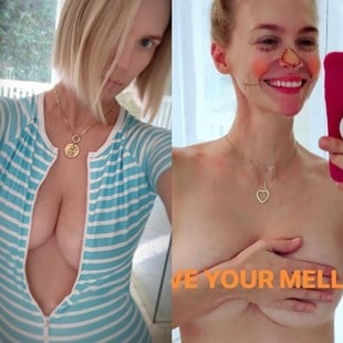 Former “Mad Men” and “X-Men: First Class” star January Jones shows off her new bulbous boobies in the selfies above and braless see through top photo below.