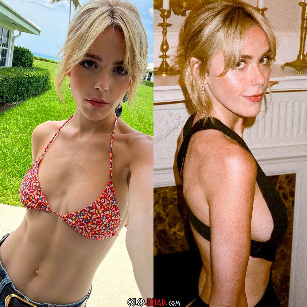 Of course a brazen exhibitionist like Kiernan Shipka would not stop there, as she also faunts her taut tummy in a bikini top in the photo above and again while on the red carpet in a bra top in the video clip below.