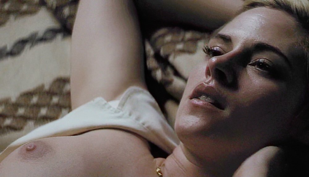 Kristen Stewart shows off her pleasingly underdeveloped breasts in the interracial sex scenes below from her new film “Seberg”.