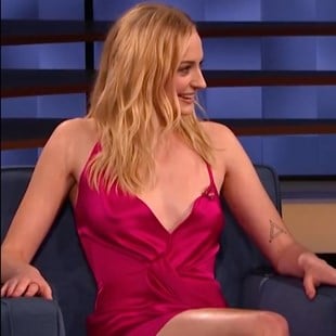 Sophie Turner jiggles her tits and protruding pierced nipples while braless in a slutty low cut silk dress in the video clips below.